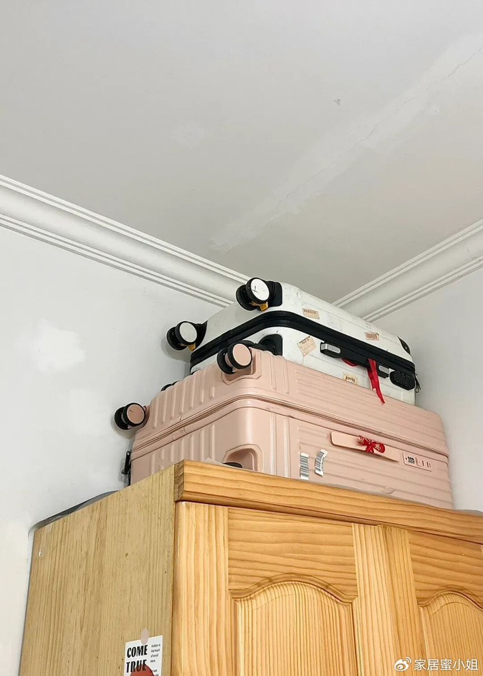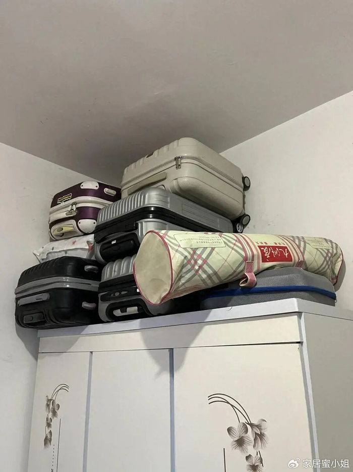 还有一些老式的行李箱,平常没什么地方收纳,只能放在衣柜上面。扔了觉得很可惜,留着看起来又特别闹心。