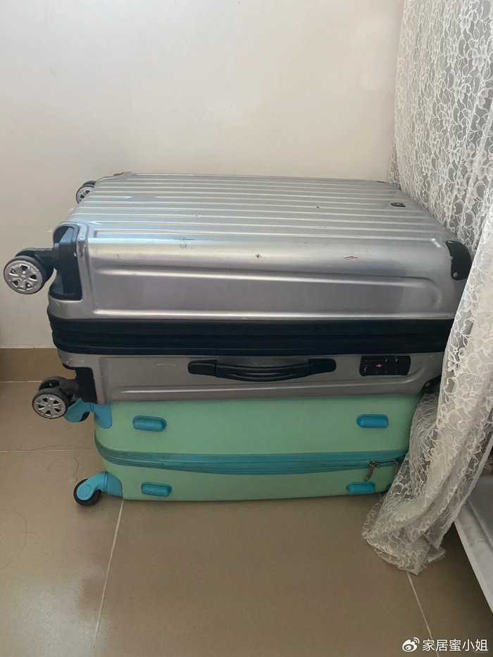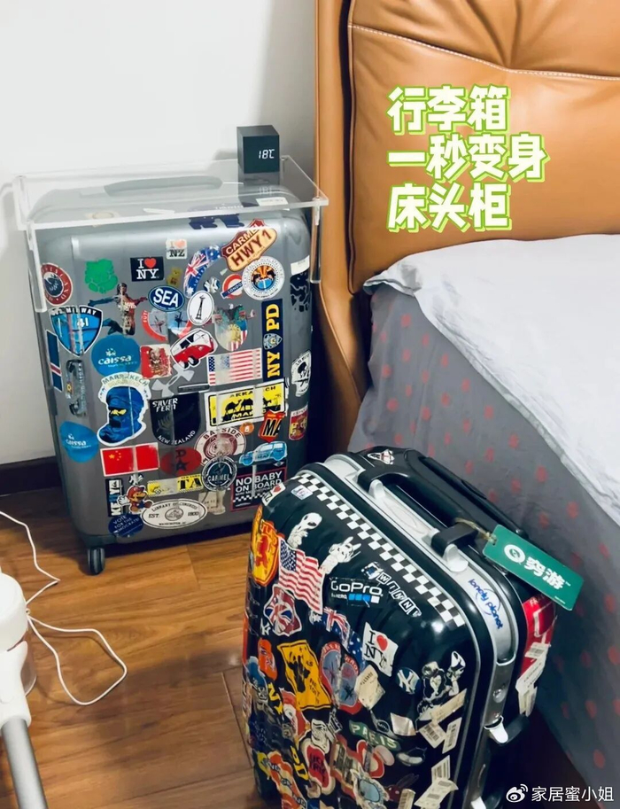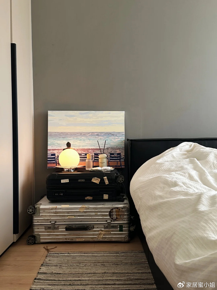 本来还以为会难看,其实摆好了也是艺术感满满的,既解决了行李箱的收纳问题,也能让闲置的行李箱重新发光发热,也不用再去买床头柜了,简直就是一举多得。