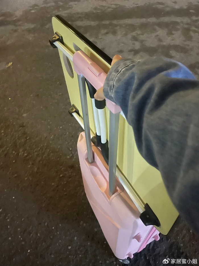 改造方法也非常简单,只需要在网络上提前买4个桌脚,然后再用螺丝把它固定在行李箱上就可以了。