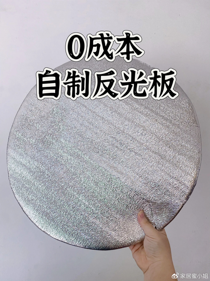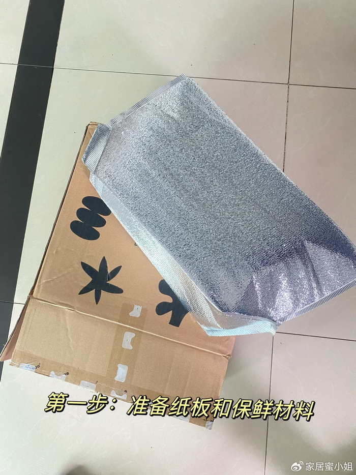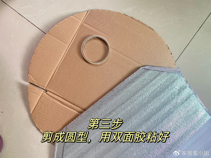 只需要找到一个废纸箱,然后裁剪成合适大小的原形,再用双面胶把保温袋粘贴在纸板上,直至将纸板全部包裹,就得到了一个反光板。
