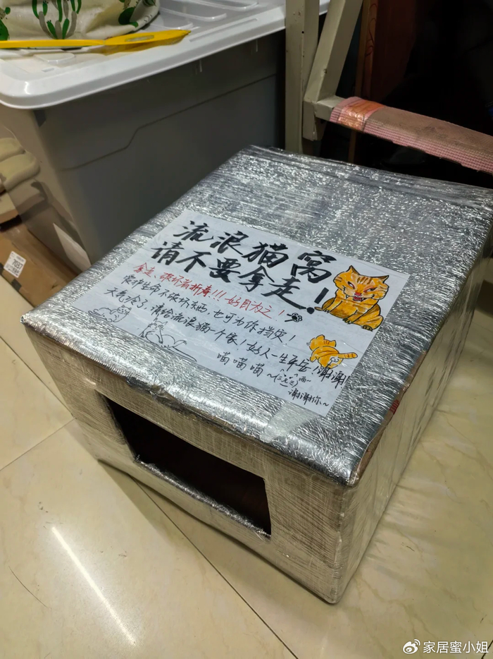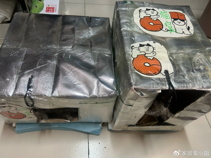 可以找一个比较大的纸箱子,然后做出一个房子的形状,再把保温袋裁剪一下,铺满箱子里外,既挡风又保暖,放在小区里,就不担心毛孩子受冻了。