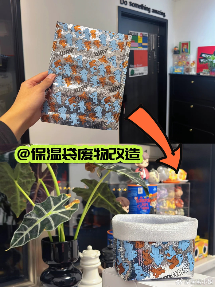 于是有一些脑洞大开的网友,硬生生把这些外卖的包装袋改造成了实用的家居好物。