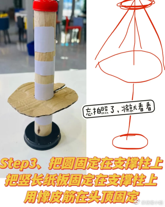 把刚才剪裁好的纸壳,固定在支撑柱上面。