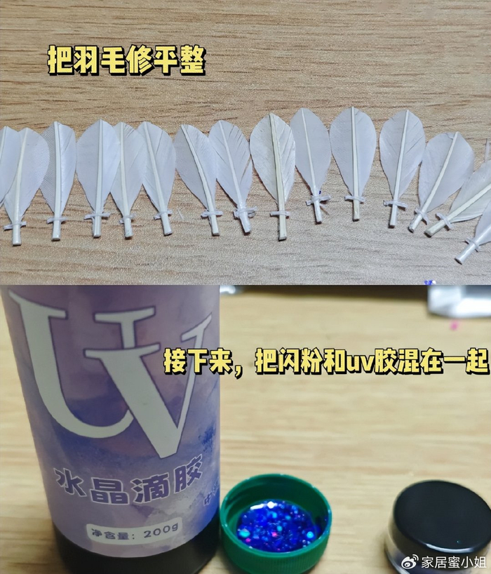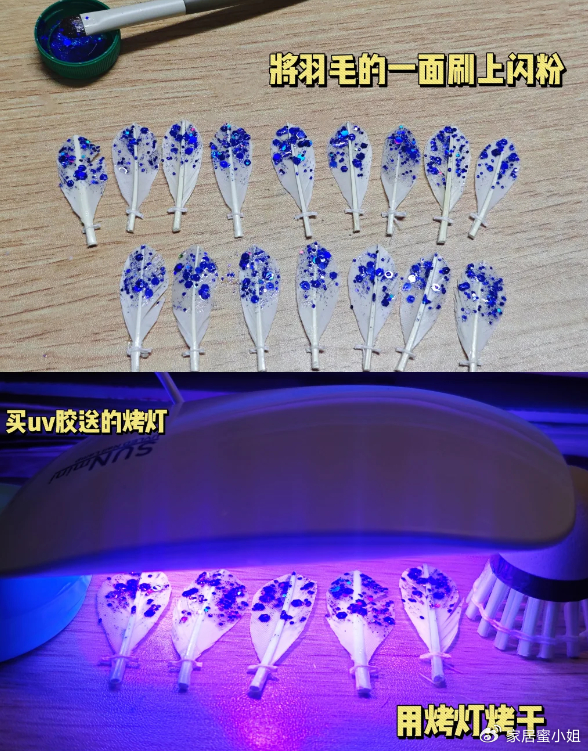 把羽毛的一面刷上闪粉,然后用烤灯烤干。