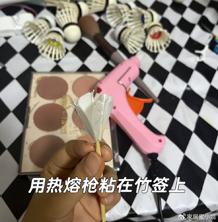 用热熔胶,把剪下来的羽毛球毛毛粘贴在竹签上。