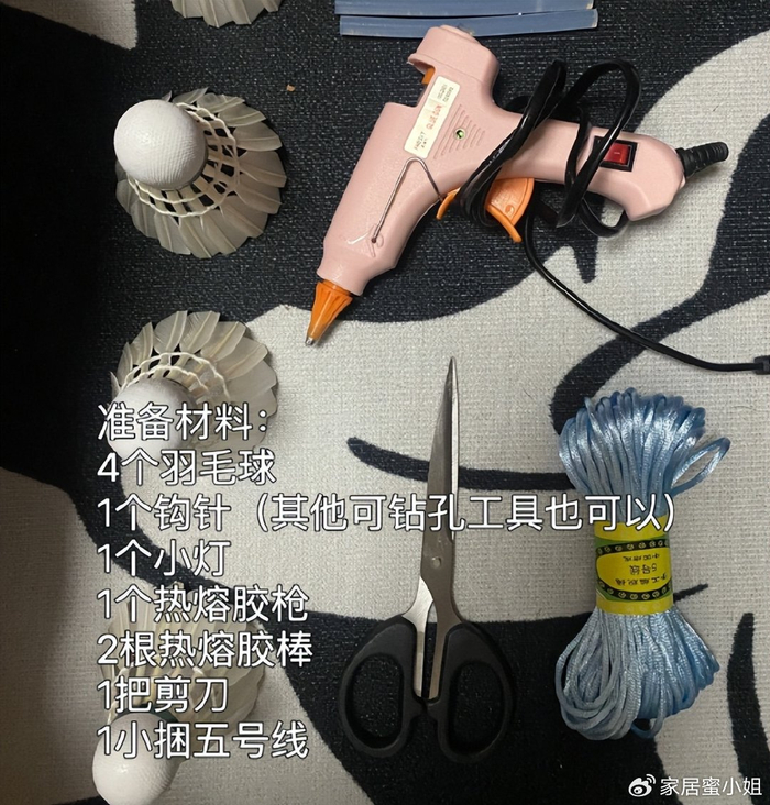 先来准备一下材料:4个羽毛球,一个钩针、一个小灯、热熔胶枪、剪刀、5号线。
