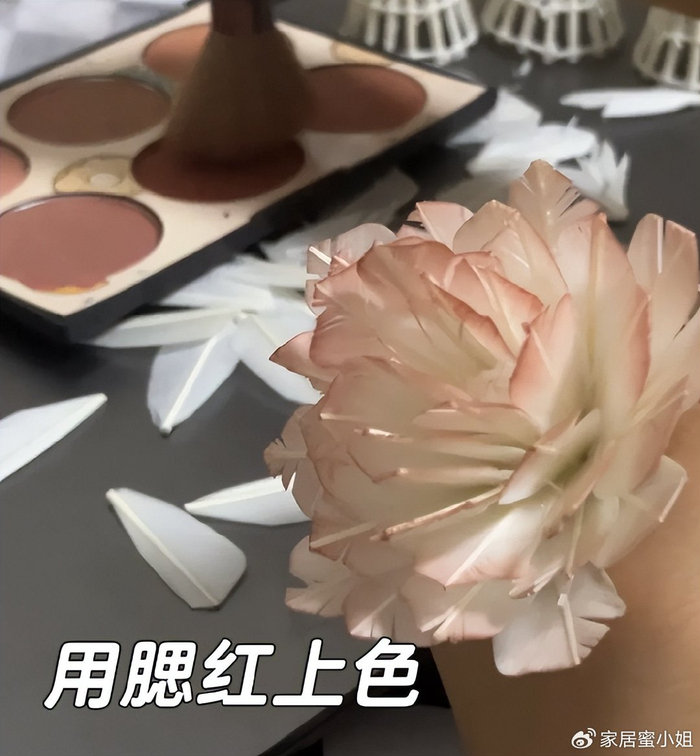 粘贴好了之后,再用腮红进行上色,把羽毛球毛毛涂上花朵的颜色。