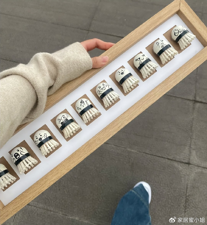 羽毛球剪裁一下,球头上画上表情,粘贴在相框里面,实在是太有趣了。