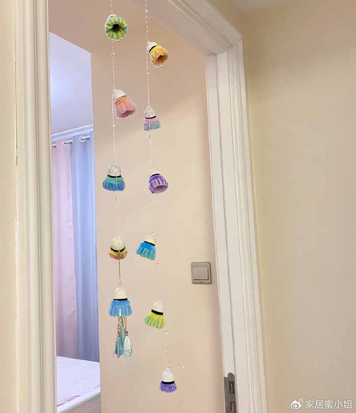再把羽毛球用线串联在一起,挂在门上,这不就是门帘吗?多有童趣啊!