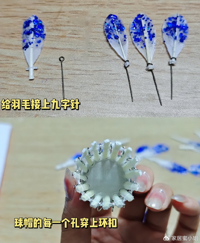 把羽毛上接上九字针,球帽上面的每一个孔都穿上环扣。