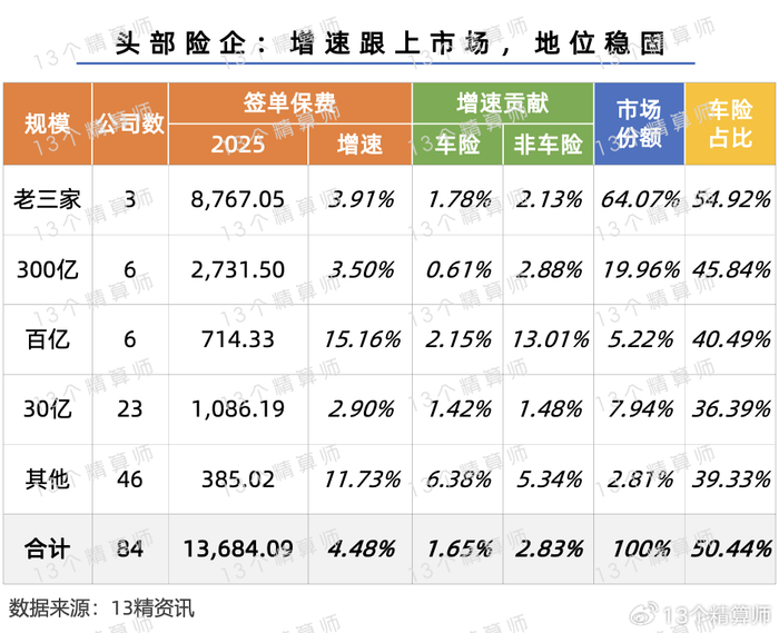 “13精”还整理了两大险类业务,对各家险企的增速贡献(增速贡献≠增速),详见上图。
