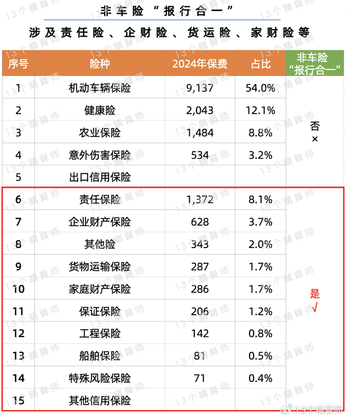 2025年11月,非车险“报行合一”全面实施,主要涉及责任险、企财险、货运险、家财险等10类险种,详见上图。