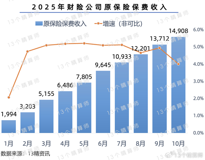 从规模端看,2025年10月末,财险公司的原保险保费收入超1.49万亿,同比增速在4%左右。