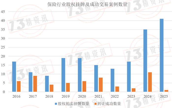 然而,与之形成鲜明对比的是成交比例极低。根据“13精”的不完全统计,2016-2025年期间保险公司股权转让的挂牌案例中,成功交易的比例仅为28%,约有72%的股权转让未成功,不少股权历经多次挂牌或多轮拍卖仍未找到买家。