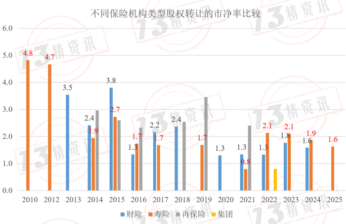 “13精”还给出了各年度不同保险机构股权转让的市净率。