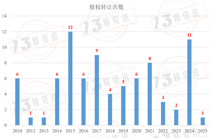 2010年-2025年期间,“13精”共收集了保险行业81个股权转让案例,其中2015年是股权转让次数最多的年份。需要说明的是,股权转让数据不含股东增资情景。