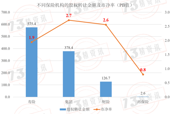 再保险行业的股权转让金额为2.6亿元,市净率(PB值)为0.8。