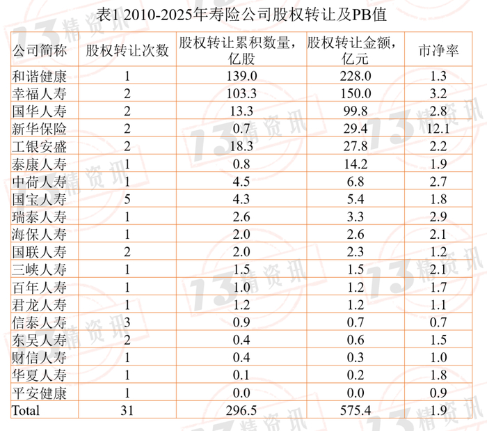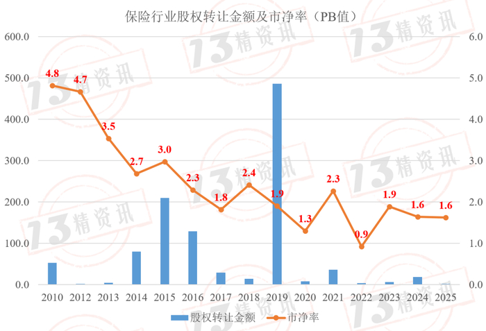 其中,2010-2025年期间,寿险行业的股权转让金额为575.4亿元,市净率(PB值)为1.9。
