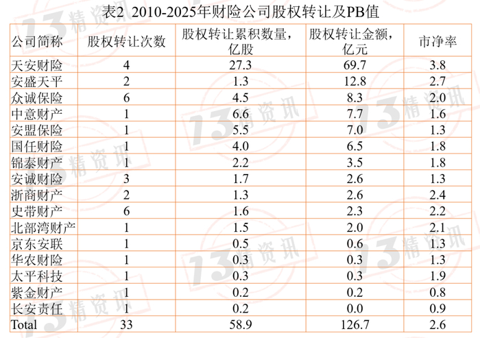 财险行业的股权转让金额为126.7元,市净率(PB值)为2.6。