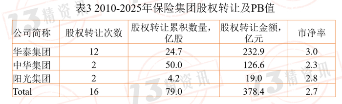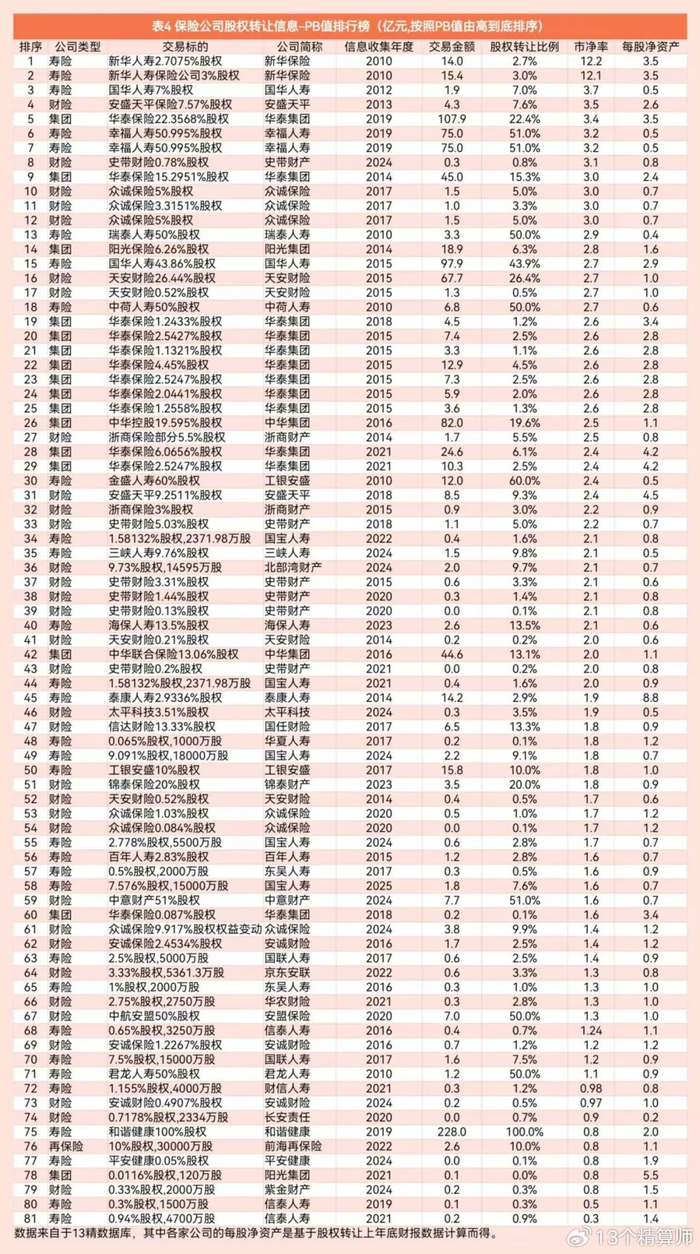 “13精”总结了这些股权转让数量、交易金额等指标,并补充了标的公司净资产、标的公司总股本等财务指标,由此计算了保险公司的市净率。