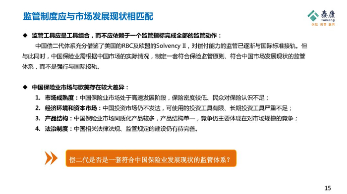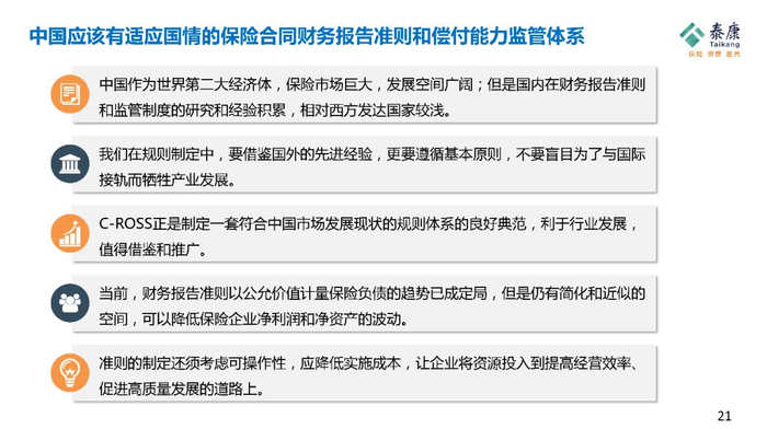 监管机构应该对自己有足够的自信,中国是不是一定要跟国际接轨,即使要接轨欧洲也不代表国际,欧洲的发展跟中国未来要走的路差异是很大的,中国的保险监管制度可以借鉴欧洲和美国的制度,中国可以有自己的监管理念和政策,这套政策应该符合中国未来20年的发展,符合中国的文化,符合中国老百姓购买保险的习惯。