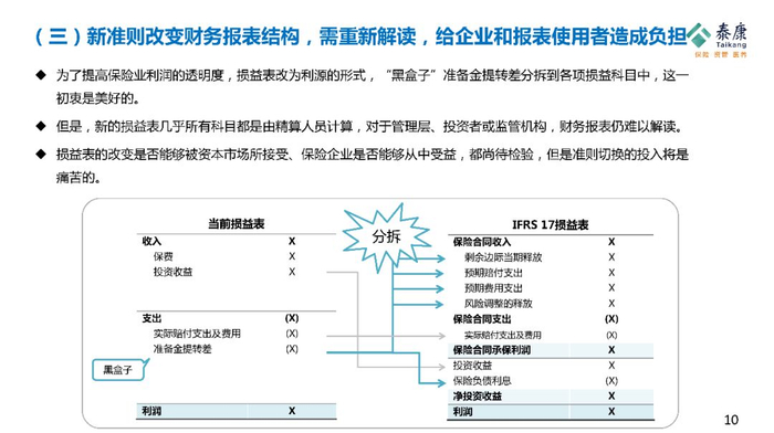 接下来,我们来看看过去传统的损益表,用的是大家很熟悉的概念,收入-费用=利润,可是新准则就不一样了,用的是保险合同的收入、剩余边际释放、预期赔付、预期费用,这些全部是精算的概念。