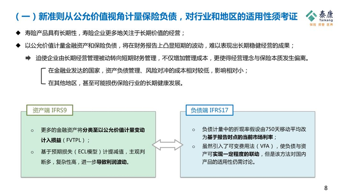 另外,IFRS 17会把折现率从750天的移动平均改成当天的利率,因此可以预期,保险公司负债的准备金的波动都会变得非常巨大。最后,新的会计准则虽然引进了可变费用法(VFA),希望负债与资产可实现一定程度的联动,但这个方法论可不可行,我觉得以中国现有的资本市场的投资工具,他产生的效果是非常有限的。