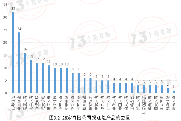 图3.2给出了28家寿险公司投连险的产品数量状况。产品数量排在前三的是友邦保险、中美联泰和泰康人寿,产品数量分别为32个、24个和16个。