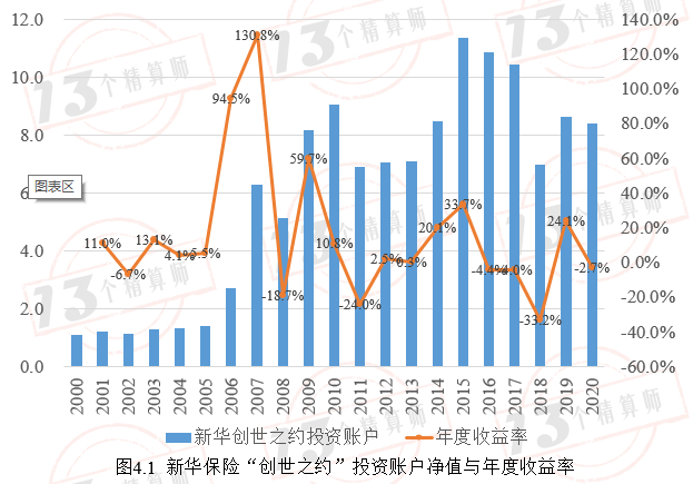 图4.1给出了新华保险“创世之约”投连险的年度净值及收益率状况。