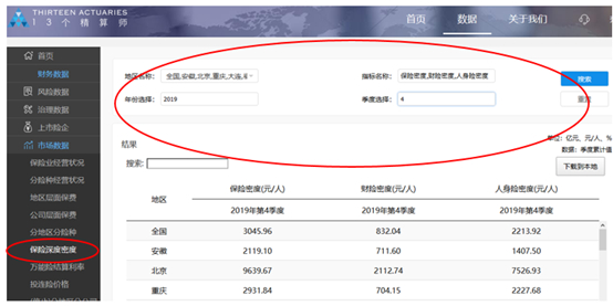 13精数据库-市场数据-增加2019年4季度各地区保险密度;