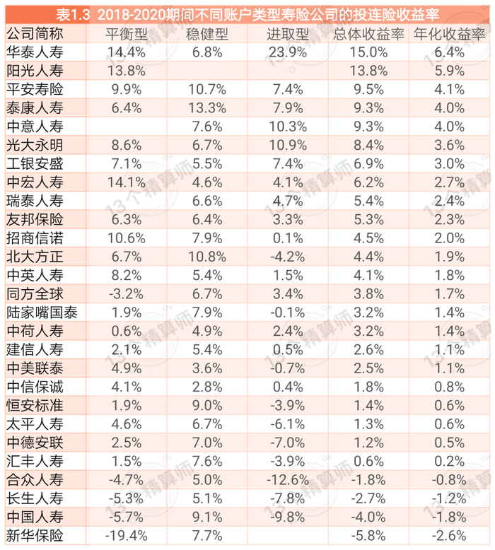 表1.3给出了2018-2020年期间各家公司投连险产品的平均收益率和年化收益率状况。华泰人寿年化收益率为6.4%,居第一位;阳光人寿年化收益率为5.9%,居第二位。