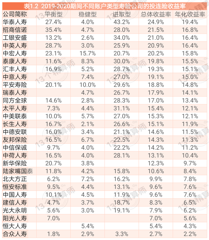 表1.2给出了2019-2020年期间各家公司投连险产品的平均收益率和年化收益率状况。由于2019年上证指数收益率高达22.3%,使得在这一统计区间内,进取型产品产生的高收益率也格外惹眼。