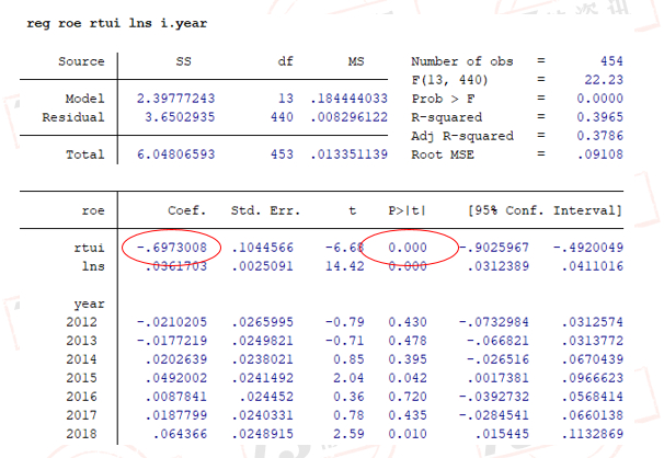寿险公司净资产收益率使用roe表示,退保率使用rtui表示。此外,我们还控制了公司规模、时间虚拟变量。