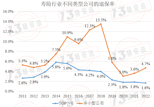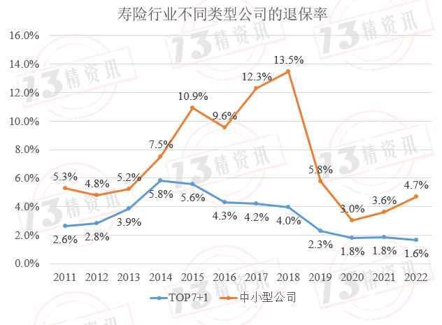 2022年度“TOP7+1”退保率为1.6%,创历史新低;中小型寿险公司的退保率为4.7%,经历过2019、2020年度大幅度下跌后,已经连续两个年度出现反弹上升了。