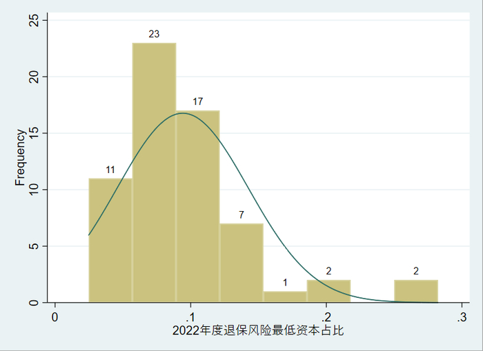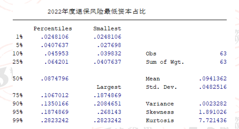 相应地,我们也给出了63家寿险公司退保风险占量化风险最低资本的比重,其平均值为9.4%,中位数为8.7%,最大值为28.2%,最小值为2.5%。其中有3家公司退保风险占比超过20%。