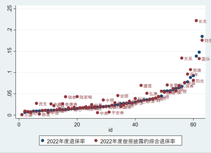 此外,我们还制作了2022年度“13精”计算的退保率与偿报公布的综合退保率的散点图。