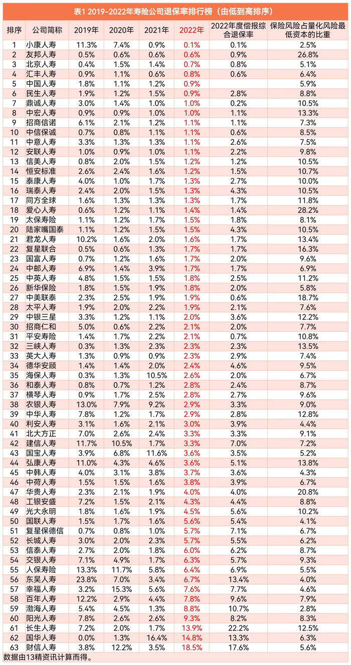 3、“13精”统计2017-2022年度各家公司的退保率指标,明细可见正文。