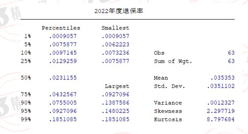 针对2022年63家寿险公司退保率做了描述统计。简单平均退保率为3.5%,加权平均退保率2.3%,中位数为2.3%,退保率最高的公司为18.5%。