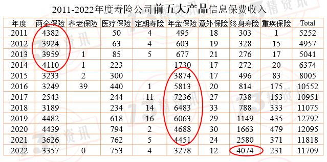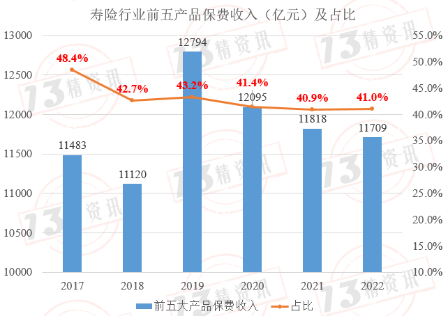 2022年寿险行业前五产品保费收入合计达到1.17万亿元,占行业原保险保费总收入的41%。