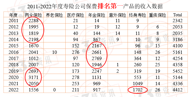 值得关注的是,受增额终身寿险产品的热销,2022年度有35年公司保费收入排名第一的产品均是终身寿险,保费收入规模约1702亿元!