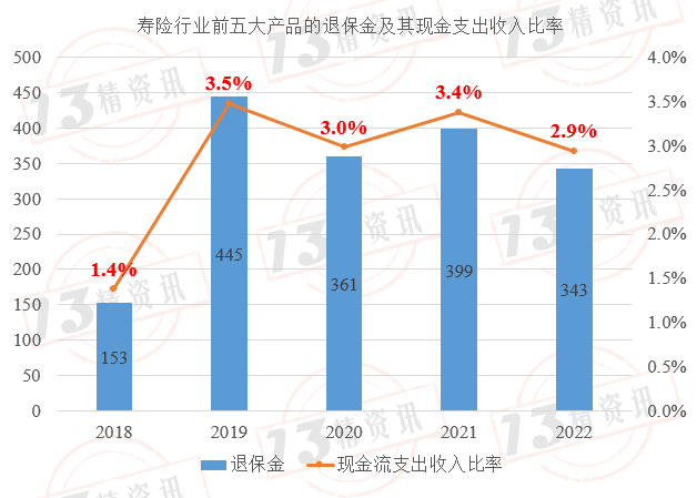 2022年寿险公司前五产品的退保金为343亿元,现金流支出收入比率为2.9%,同比下降了0.5个百分点。