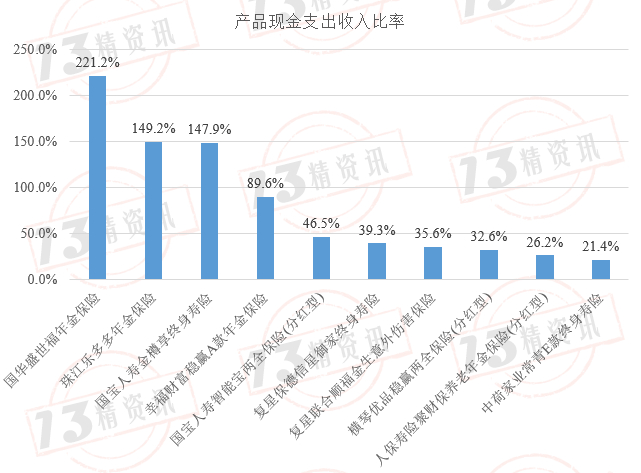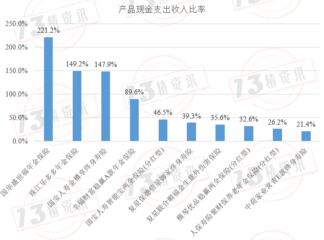 除了单一产品的保费规模外,我们还给出了保险产品现金流支出收入比率的排行榜。