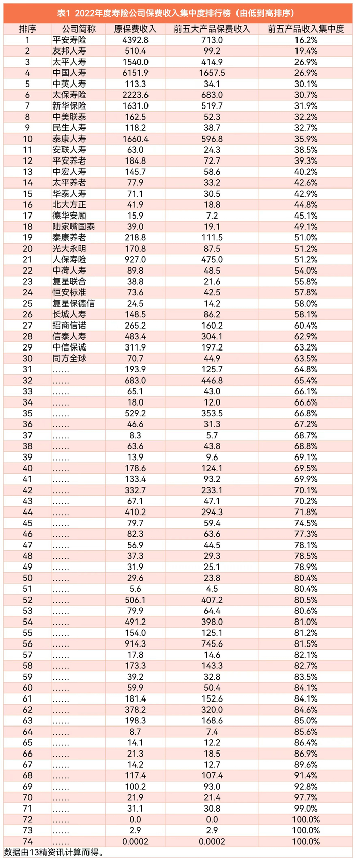 1、基于前五大产品保费收入信息,“13精”使用前五大产品保费收入占公司总保费的比重作为衡量公司产品集中度的指标。