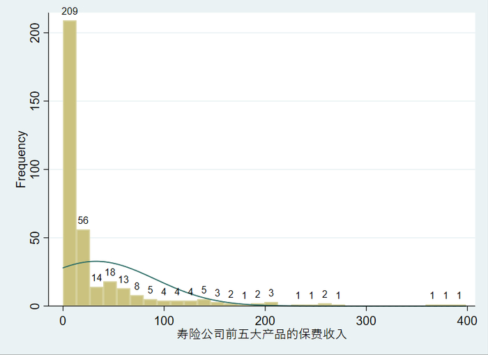 从359款产品描述性统计来看,产品平均保费收入32亿元,中位数仅有9.9亿元,最小值为2万元,最大值为398.5亿元。