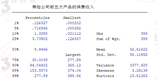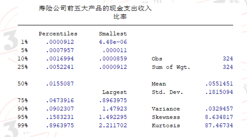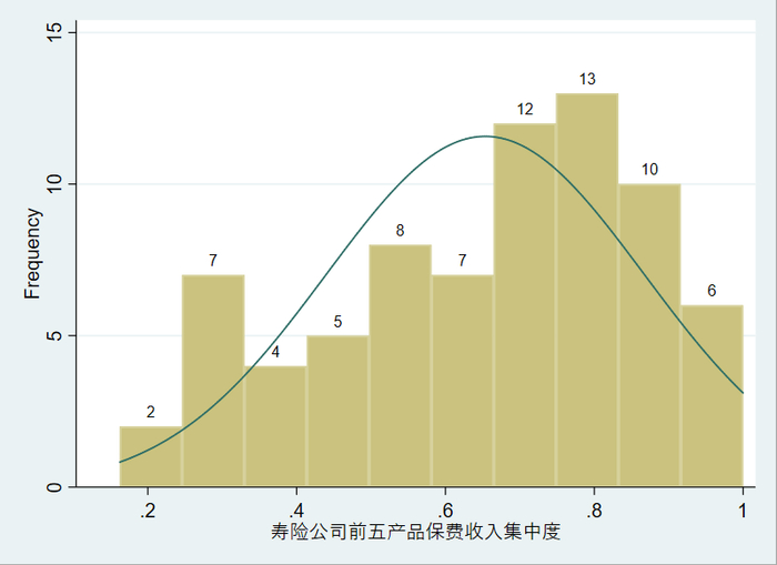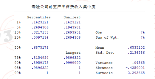 “13精”给出了2022年度寿险公司前五产品保费收入集中度的描述性统计。