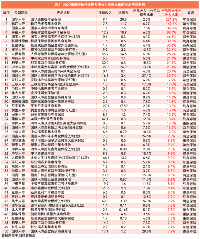 “13精”列出2022年度寿险公司产品现金流支出收入比率排名前十的产品(由高到低排序):