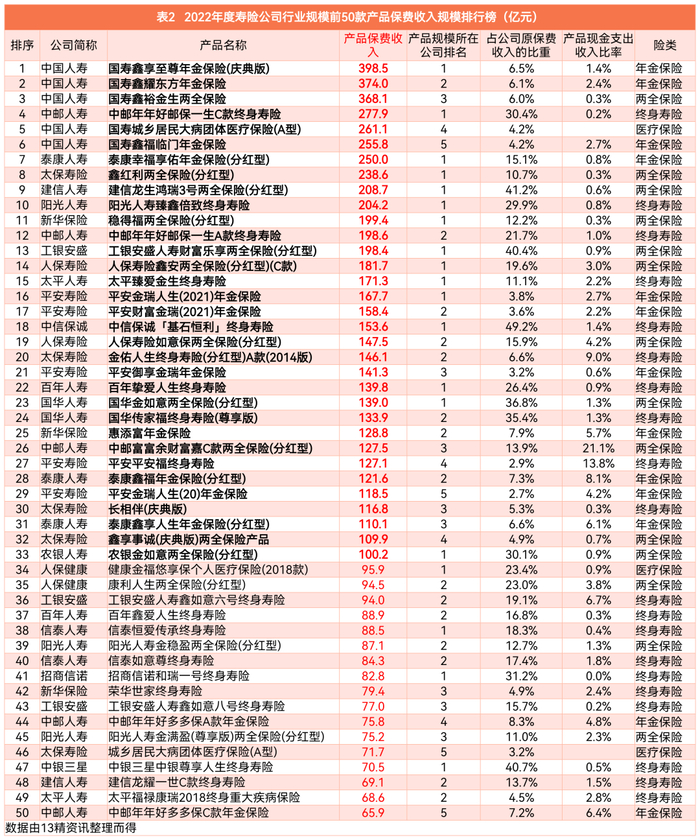 “13精”给出了2022年度寿险公司保费规模排名前50的产品榜单(全部359款产品可登录“13精资讯机构版”查询):