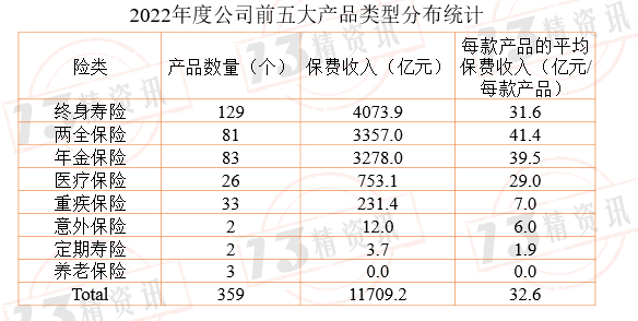按照单一产品的保费规模,我们将2022年寿险公司前五共计359款产品的保费收入进行排序。