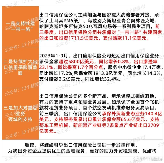 其中,出口信用保险公司发挥独特作用,一是支持共建“一带一路”,二是持续扩大出口信用保险覆盖面,三是加大对重点业务领域的支持。