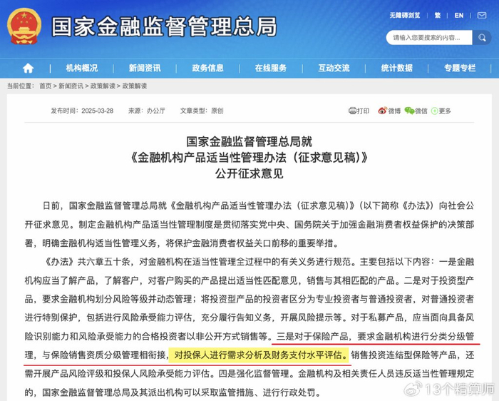 3月28日,金融监管总局下发《金融机构产品适当性管理办法(征求意见稿)》,并公开征求意见。